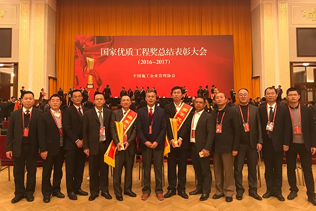 ----記金輝華集團(tuán)北京人民大會(huì)堂捧杯國(guó)優(yōu)工程兩項(xiàng) 表彰大會(huì)合照(人民大會(huì)堂),左四為金輝華集團(tuán)董事長(zhǎng) 2017年 12月13日,由中國(guó)施工企業(yè)管理協(xié)會(huì)主辦的“2016-2017年度國(guó)家優(yōu)質(zhì)工程獎(jiǎng)總結(jié)表彰大會(huì)”在北京人民大會(huì)堂舉行。廣東金輝華集團(tuán)有限公司“江門市中心醫(yī)院外科住院大樓工程”和“臺(tái)山新寧體育館及人防工程”,榮獲國(guó)家優(yōu)質(zhì)工程獎(jiǎng)兩項(xiàng)。 金輝華集團(tuán)的業(yè)務(wù)發(fā)展始終注重質(zhì)量、安全和效益