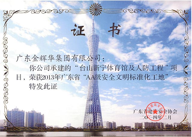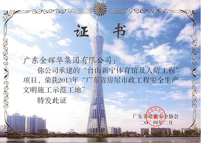 熱烈慶祝我公司“臺(tái)山市新寧體育館及人防工程”榮獲廣東省房屋市政工程安全生產(chǎn)文明施工示范工地。