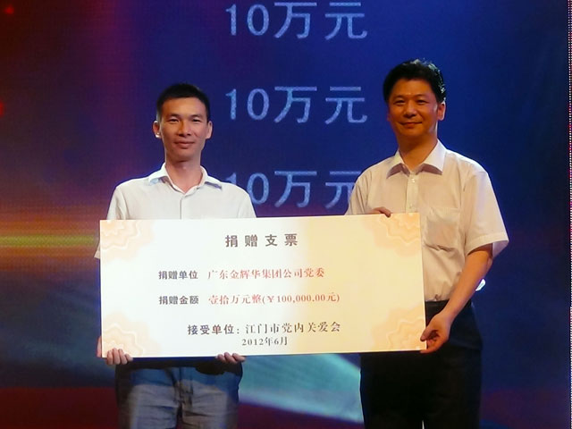 6月29日,中共江門市委組織部、江門市“兩新”組織黨工委在東湖影劇院舉辦“唱響主旋律,喜迎十八大”文藝晚會,江門市“黨內(nèi)關(guān)愛工程”啟動儀式為晚會揭開序幕,我集團公司董事長張國球先生現(xiàn)場捐贈10萬元,為“書記項目”——“以黨員企業(yè)家引領(lǐng)黨內(nèi)關(guān)愛工程”出一份力。 圖為集團公司董事長張國球先生向江門市黨內(nèi)關(guān)愛會捐款晚會上,我集團公司選送了具有開平僑鄉(xiāng)特色的文藝節(jié)目《洋妞看碉樓》,以精采的表演歌頌和贊揚黨
