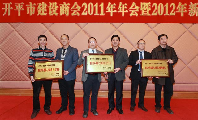 2012年2月28日下午,市領(lǐng)導(dǎo)黃耀雄、文彥、張星杰、梁和平、陳偉成、鄺業(yè)禮、凌華威、黃繼燁出席建設(shè)商會2011年年會暨2012年新春宴會。此次宴會旨在表彰先進(jìn),弘揚典型,為推動重振開平建筑之鄉(xiāng)雄風(fēng)工作再創(chuàng)輝煌。在過去一年里,許多建筑單位在企業(yè)發(fā)展、科技創(chuàng)新、繳納稅收等方面成績顯著。對此市人民政府決定對我集團(tuán)公司等18家企業(yè)予以表彰。會上,市領(lǐng)導(dǎo)黃耀雄、文彥、張星杰、梁和平、陳偉成、鄺業(yè)禮、凌華威