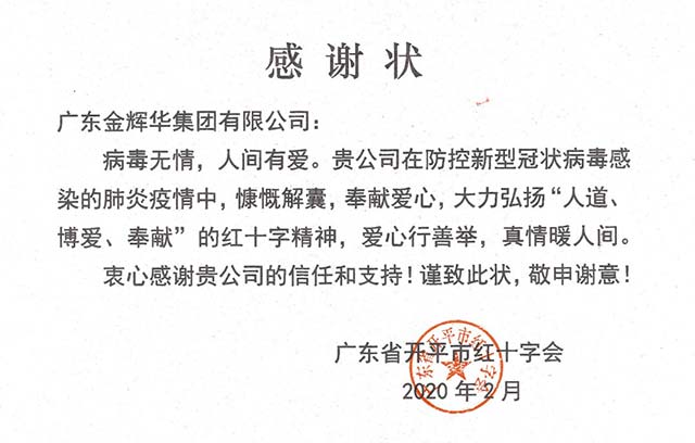 今年春節(jié),一場突如其來的新型冠狀病毒感染的肺炎疫情牽動(dòng)著每一個(gè)人的心,更牽動(dòng)著每一位金輝華人。新型冠狀病毒感染的肺炎疫情(簡稱“疫情”)發(fā)生后,在習(xí)近平總書記:生命重于泰山,疫情就是命令,防控就是責(zé)任的指引下,并在開平市新冠肺炎疫情防控指揮部的統(tǒng)一部署下,開平市紅十字會(huì),慈善會(huì)共同發(fā)布了《開平市紅十字會(huì)、開平市慈善會(huì)關(guān)于募集我市疫情防控工作資金和物資的倡議書》。廣東金輝華集團(tuán)有限公司積極響應(yīng)、踴躍捐贈(zèng),體現(xiàn)了本公司“一方有難、八方支援、同舟共濟(jì)”的優(yōu)良傳統(tǒng)。2020年2月3日,公司定向捐贈(zèng)長沙街道辦事處10萬元,開平市20萬元,合計(jì)30萬元用于新冠肺炎疫情防控。用自己的方式,傳遞著建筑人的溫度、溫情和專業(yè)力量,展現(xiàn)民營企業(yè)的責(zé)任擔(dān)當(dāng),全力做好疫情防控工作,為開平的疫情防控全局作出了積極貢獻(xiàn)。