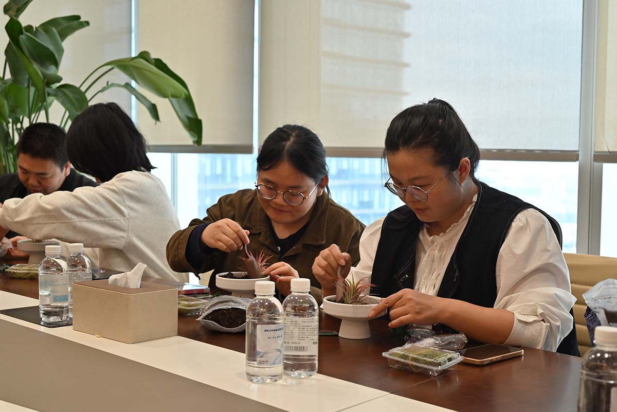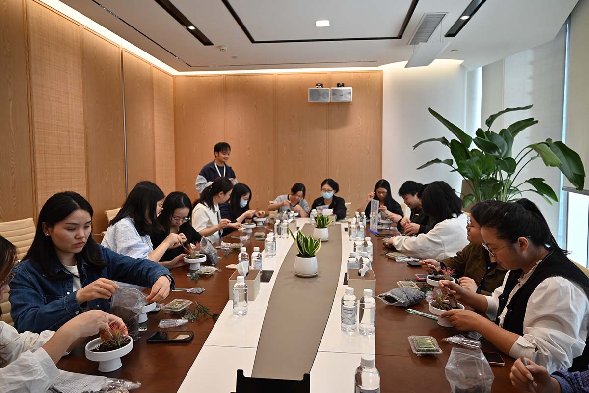 在專業(yè)講師的指導(dǎo)下,集團(tuán)公司組織員工運(yùn)用天然水晶與香草植物,親手制作桌面微景觀。員工們依照講師的講解與演示,從置土、種植、擺放水晶到澆水,一步步沉浸其中,體驗(yàn)自然靈動(dòng)之美,收獲心靈寧?kù)o。
